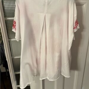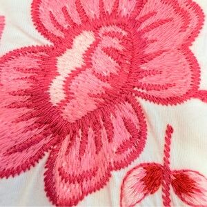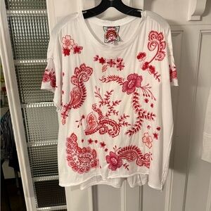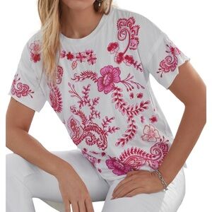 Excellent like new condition. Women’s Johnny Was Cassia pink & red floral embroidered, short sleeve tee shirt. Raw edge hem & sleeves, 100% cotton, relaxed fit, size XL. MSRP $138
