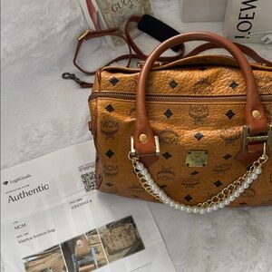 Stylish MCM satchel with iconic monogram. Features elegant pearl chain accent. Perfect for versatile wear.