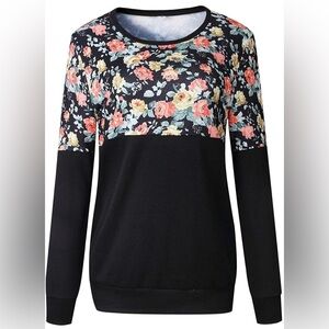 Design: The pullover features a vibrant floral print on the upper half and sleeves, with a solid black bottom half and black trim around the neckline and cuffs.