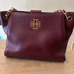 Chic Tory Burch mini shoulder bag in gorgeous burgundy leather. Features gold-tone chain accents. Perfect for stylish outings. See dimensions in pics.