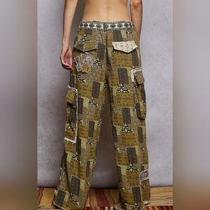 Stylish wide leg pants with patchwork design. Features olive and beige tones. Comfortable fit with tie waist. Waist is 14 stretched to 15 inches.