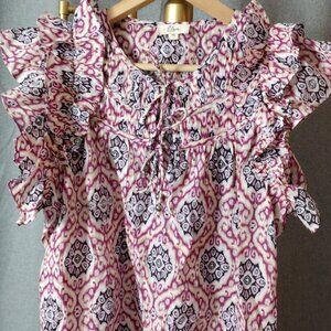 Elan Women’s XL Boho Ikat Print Blouse Ruffle Sleeve Tie Neck Top NWOT