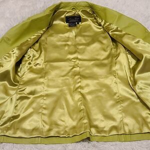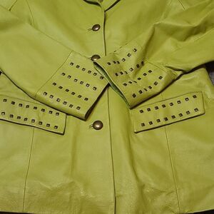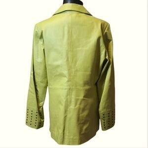 Studded Leather Blazer Style Coat, in like new condition. Two front pockets with bronze studding as well as arms. 4 button closure. Color is a "split pea soup" green, olive green.
