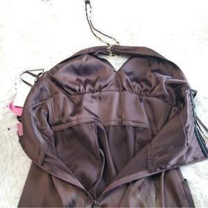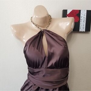 Built in bra Cup. Has some stretch. Dark chocolate brown with gold hardware. Ties at neck. Keyhole