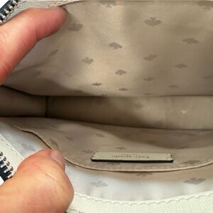 Features zip-top closure, interior slide pocket, exterior zip pocket, adjustable strap (22” drop), and signature spade jacquard lining.