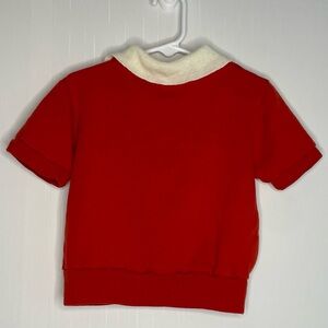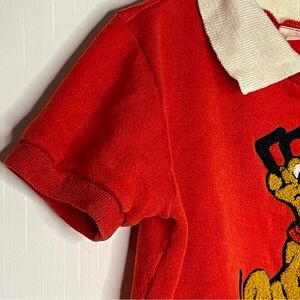 Rare Vintage Disney Pluto kids short sleeve, soft sweatshirt with a large, textured embroidered graphic of Pluto on the front. Color red, short sleeve sweatshirt with a contrasting white knit collar (collar is thin). A prominent, high-quality embroidery of Pluto the dog sitting and smiling. Ribbed hemline on sleeves and bottom. HTF✔️ No holes but does have one dot size stain on the front by the tail of Pluto pointed out in the picture with an arrow, zoom in on pictures for full details. Photos of inside and outside of garment included. No tag information, CHECK MEASUREMENTS IN PICTURES the listing size is just an estimate size 2-3
