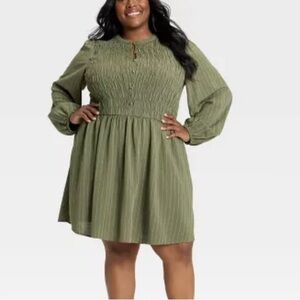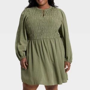 Bishop Long Sleeve Button-Up Smocked Mini Dress Ava & Viv™ Olive Green Pinstripe