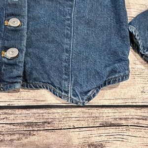 Chic Levi's denim cropped corset shirt with button-down front. Features long sleeves and stylish design. Ideal for casual wear. Super cute with low rise jeans.