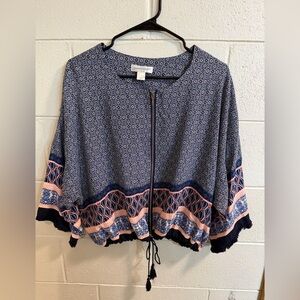Christopher & Banks cropped jacket or blouse, identifiable by the brand tag visible in the image. It features a blue and pink mosaic or geometric pattern, a full-zip front, and a tassel drawstring at the hem.