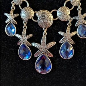 This stunning necklace features a silver starfish design with captivating blue accents on blue leather strands. Perfect for adding a classy touch to any outfit.