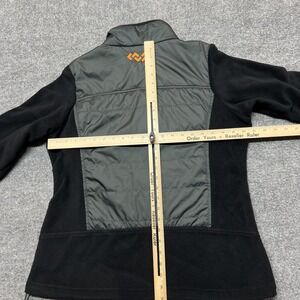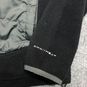 Pre-owned jacket with light wear including some lint and minor fleece fuzzing from normal use. Fleece, quilted polyester panels, and Omni-Heat lining are clean and intact with no holes or stains. Front zipper, drawcord hem, and embroidered logos are secure and fully functional.