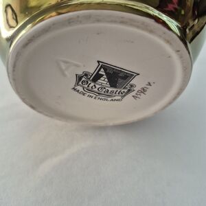 Pink gold green hand painted copper porcelain Lusterware pitcher creamer. Collectible Old Castle numbered series made in England. Measurements are approximate measurements: 5 1/2 inches tall. Holds 28 oz (3 cups)