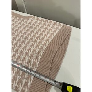 Houndstooth sweater vest in a soft neutral tan and white knit offers a timeless, preppy aesthetic. Crafted with a classic V-neckline and ribbed trim at the armholes and hem, this versatile piece is perfect for layering over button-downs or wearing on its own. The mid-weight knit provides a comfortable, slightly relaxed fit that pairs effortlessly with denim or trousers for a polished look. This item is in excellent pre-owned condition.