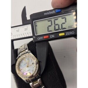 Excellent condition. Near mint except for some minor signs of wear near the clasp. 8 diamond markers on the bezel. Shimmering Mother of Pearl dial.