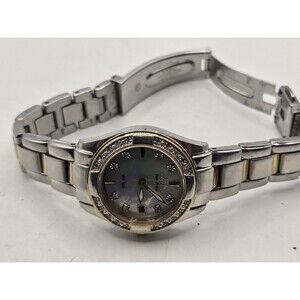 The Citizen Eco-Drive Ladies' Two-Tone MOP Dial Diamonds EW1824-57D is a stylish wristwatch designed for women. featuring a Mother of Pearl dial pattern and diamond accents, this elegant timepiece has a left-handed design with a stainless steel case and bracelet band. The quartz movement ensures accurate timekeeping, making it a practical yet fashionable accessory for any watch lover.