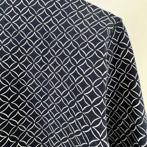 Crafted from a comfortable cotton-spandex blend, this full-zip jacket features a striking geometric tile pattern in navy and white. The design includes a high-neck collar and ribbed cuffs for a structured yet flexible fit, perfect for layering during active pursuits or casual outings. A subtle striped detail accents the zipper track, adding a touch of sporty sophistication to the overall aesthetic.