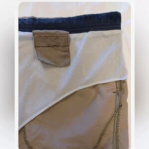 Tan colored, these swim trunks are mesh lined with a drawstring waist. Featuring three outside pockets and one secret pocket with a callout on the thigh. Little to no stretch available.
