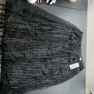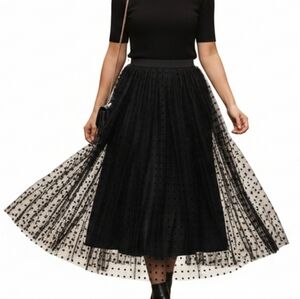 Gorgeous black midi skirt featuring a pleated tulle overlay with velvet-feel polka dots. Perfect for dressing up with heels or keeping it "street style" with a graphic tee and sneakers!