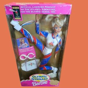 Olympic Gymnast Barbie commemorates the 100th anniversary of the Atlanta 1996 Olympic Games. This authentic collection doll features a blonde Barbie in a patriotic red, white, and blue leotard with gold star accents. She comes equipped with a magical tumbling ring that allows her to perform somersaults and cartwheels, along with a gold medal, gym bag, and hairbrush. This officially licensed product captures the spirit of the 1996 games and remains factory sealed in its original box, though the packaging shows some shelf wear and a small tear on the top corner.