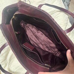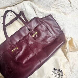 Luxurious leather tote by Coach. Deep burgundy hue. Perfect for daily use. Stylish and practical.