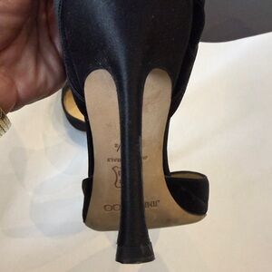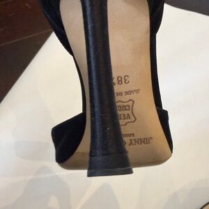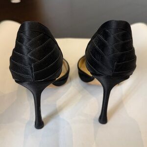Chic black silk heels with a pointed toe. Signature Jimmy Choo elegance, looks amazing on the foot.
