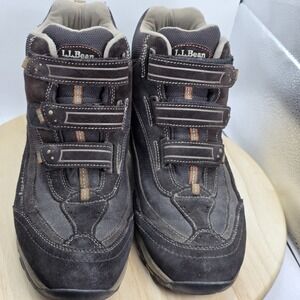 The Mens Size 11.5 L.L. Bean Tek 2.5 Primaloft brown suede hook loop hiking boots are a stylish and functional footwear choice for outdoor activities. These ankle boots feature a round toe, lace-up closure, and a cushioned insole for added comfort. The suede upper with mesh trim provides durability and breathability, making them suitable for all seasons. With three front straps and the signature L.L. Bean logo, these boots offer both style and practicality for the modern outdoorsman. Perfect for hiking and everyday wear, these boots are a versatile choice for any wardrobe.