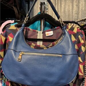 Elegant blue leather bag with gold accents. Perfect for daily use.