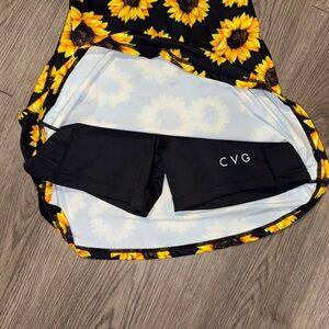 A black, sleeveless athletic-style dress with an all-over sunflower print and adjustable crisscross straps. It features a built-in low-impact sports bra with removable pads. The dress includes a built-in playsuit (shorts) underneath, which has two pockets and a back opening for easier restroom use.