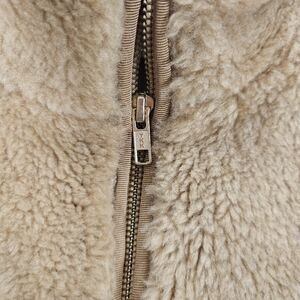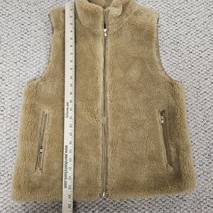 Cozy tan fleece vest with zip closure. Perfect for layering.