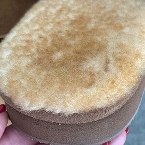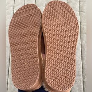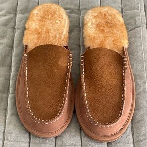 Comfortable brown slippers with plush shearling lining. Perfect for lounging.