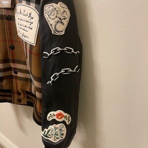 Burberry jacket featuring classic brown plaid. Black leather sleeves with unique patches. Embroidered Burberry logo on chest.