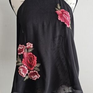 Elegant black halter top with vibrant red roses embroidery. Sleeveless design. Perfect for casual or dressy occasions.