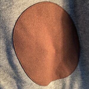 Brown faux suede details on shoulders, buttons and elbow patches.