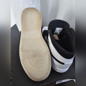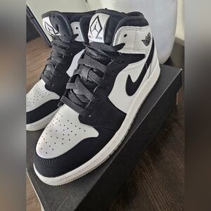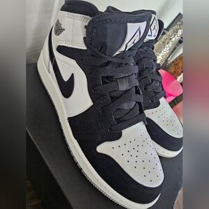 Air Jordan 1 Mid Dimond Shorts .Stylish black and white high-top sneakers with a unique logo design.