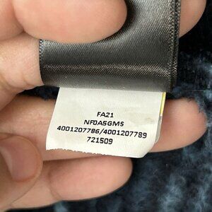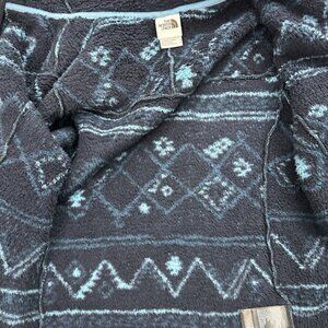This is a women's size small jacket by The North Face in aviator navy color. It is made of polyester fleece material with a geometric pattern. The jacket features long sleeves, a full zip closure, and has a cozy sherpa fleece construction.