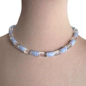 Beautiful handmade choker necklace featuring alternating lavender-blue banded beads and clear faceted glass barrel beads for a soft, elegant shimmer. The cool pastel tones give this piece a fresh, airy feel that pairs effortlessly with summer dresses, linen tops, or minimalist layers.