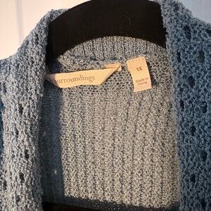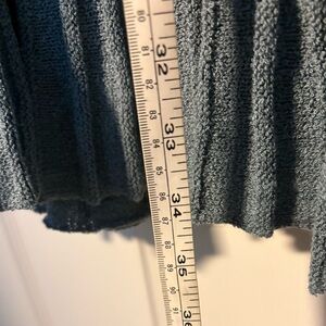 Like New - Cozy and stylish gray-green cardigan. Features textured knit design with shawl collar and tulip shape. Ideal for layering. This elegant sweater can be used for multiple occasions. Dress up a pair of jean or wear with a great skirt or dress. Lightweight fabric can be worn for multiple season with different weight tops for layering.26” arm pit to arm pit along back. 34” long. Worn once.