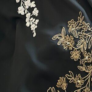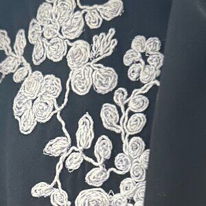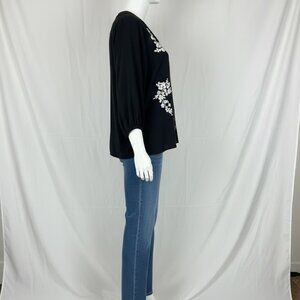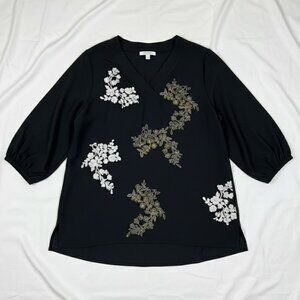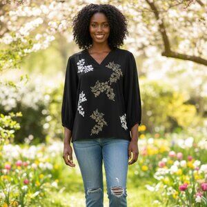 Beautiful Chico’s Black Label tunic featuring intricate beaded and embroidered floral detailing in soft metallic tones. Designed with a relaxed, flowy silhouette and 3/4 sleeves with gentle elastic cuffs for comfort. The lightweight fabric drapes effortlessly, making it perfect for elevated everyday wear, casual evenings, or boho-inspired styling. An easy statement piece that pairs well with slim pants, leggings, or denim.