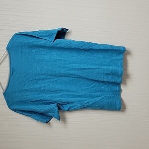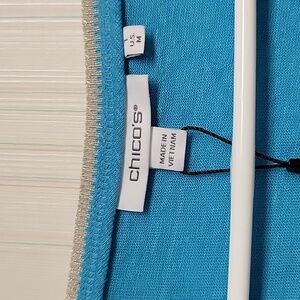 Teal blue knit top by Chico's. Features a comfortable and stylish design. 100% linen metallic trim at neck. sz 1 (small 8-10) 100% linen, 20" pit to pit flat (SH2-010)