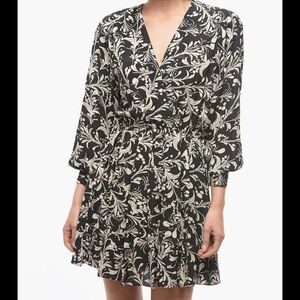 Capucine Dress in black, V neck, long sleeves, elastic waist, floral print, 100% Viscose, Made in China