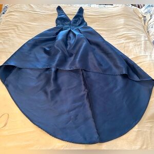 Stunning XS Moonlight Dance Navy Blue Beaded High-Low Maxi Dress-Great Preowned Condition-used only once by my petite 5’ 2” daughter who found the dress to be too large for her. Note: you may or may not need to use cleavage tape to hold down the front material around breast area. It can be difficult to remove the sticky tape from inside the cleavage area after use, & leaves a little bit of tape on it. Please See pictures. However, it’s not at all noticeable since it’s on the inside of the cleavage area. This dress is great for formal events. Shiny woven taffeta shapes the gown, w/a sleeveless & plunging neckline. Sparkly blue beads adorn a fitted waist, w/a subtle cutout, atop structured box pleats that fall to a showstopping high-low maxi skirt. Hidden back zipper/clasp. Note-the color is dark Navy Blue, some lighting did not show true color.