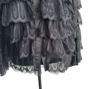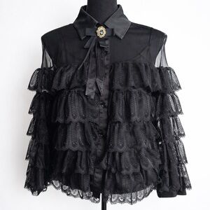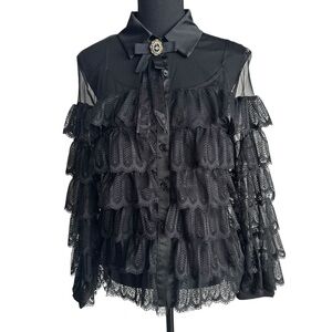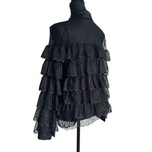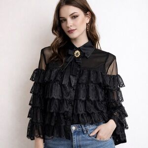 Absolutely stunning black lace statement blouse featuring dramatic tiered ruffles throughout the bodice and sleeves. This piece has a romantic Victorian-inspired silhouette with a structured satin collar, sheer mesh yoke, and cascading layered lace panels that create beautiful movement and texture.