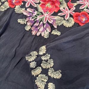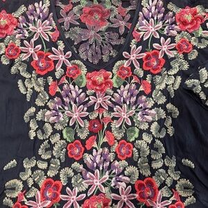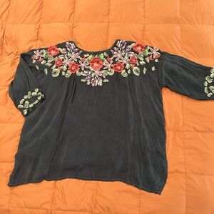 Chic blouse with intricate floral embroidery. Features vibrant colors on a black base. Ideal for a stylish look. EUC - bundle & save!