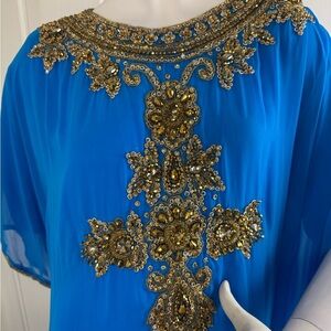 Stunning blue kaftan featuring intricate gold embellishments. Perfect for special occasions. This is a gorgeous dress with imperfection like dirt and water stains need some cleaning.