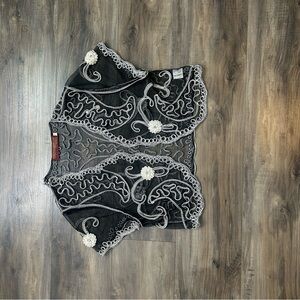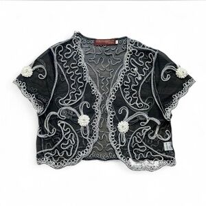Elegant sheer shrug with intricate white embroidery. Perfect for layering over dresses or tops.