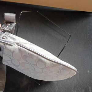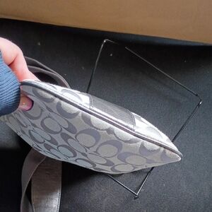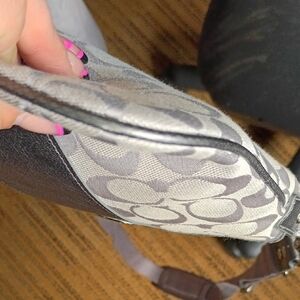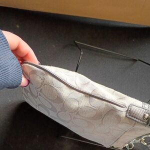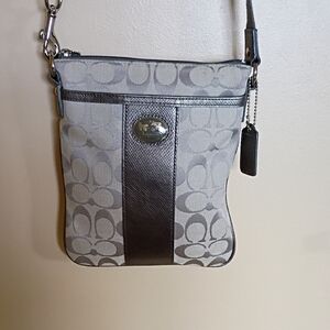 classic Jacquard canvas just a small mark on the top right corner shown in pictures.. leather trim. Small amount of rubbing on corners shown in pictures. silver hardware, no tarnishing or scratching. gray adjustable crossbody strap with shoulder pad for comfort. no call outs..leather snakes skin print stripe down the center front. excellent condition. front and back pocket. zipper enclosure.. light and dark gray with silver metallic shade. overall good use condition bag. call out barely noticeable. shows more on camera than it does in person.
