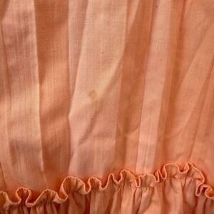 Fully functional with flaws: Dark spot on the front near the ruffle tier. Faint spot on the front near the shoulder. Discoloration at the armpits (it's covered by the capelet). Frayed interior seams (the dress is fully intact with no tears or holes). There is color variation/uneven fading that goes between light peach and dark peach.