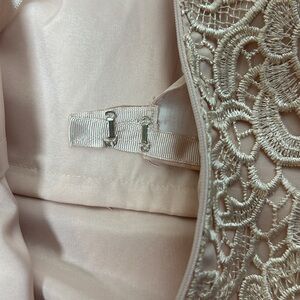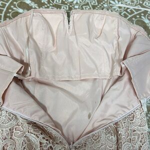 Step into elegance with this stunning strapless lace prom dress. The delicate cream color adds a touch of sophistication to your evening look. Perfect for making a memorable entrance.