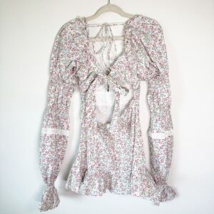 GORGEOUS! Brand new without tags. For Love and Lemons Lucca Mini Dress White Floral Lace Poplin Long Sleeve. Adorable Floral butterfly print. Underwire pleated bust with ties. Oversized sleeves with lace detail. Ruffle hem. Tie back. 100% cotton. Size Medium.