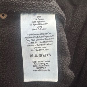 Shell is 91% cotton, 7% polyester, & 2% spandex - fleece is 100% polyester - jeans are machine washable - these have standard five pockets with button on waistband, belt loops.